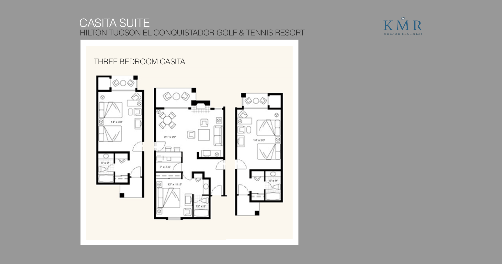 This three-bedroom suite is in the Casita Village, away from the hustle and bustle of the main resort. Relax in this residential space with separate entrances, private patios and an oversized living space with defined living and dining areas. The main bedroom features one king-sized bed, while the additional bedrooms offer their own baths, two queen beds each, and their own entrances and patio spaces.